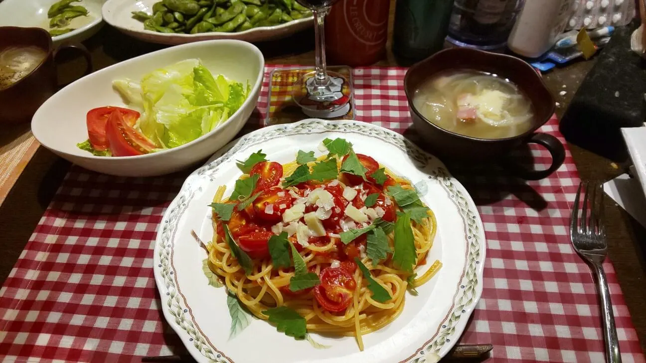トマトパスタに大葉は始めたのは実は結構最近(多分半年以内くらい)なんですけど、すっかり当たり前の光景に。バジルもいいんだけどね。っていうかバジルのこともあるけどね。