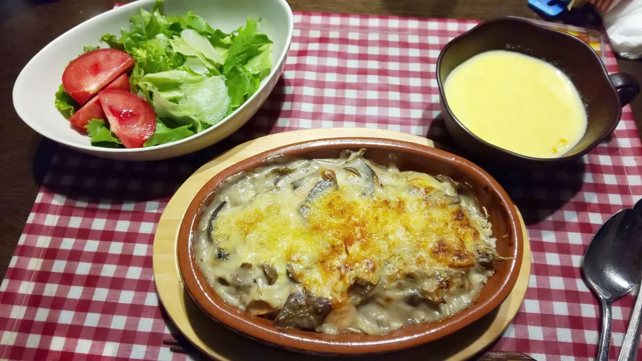商品名は珍しく母からの宣言があったためそれを採用しました。きのこたっぷりの内訳はしめじ・舞茸・マッシュルームになっております。その他に、サーモンと玉ねぎが加わり、ホワイトソースと一緒になってドリアを成しております。