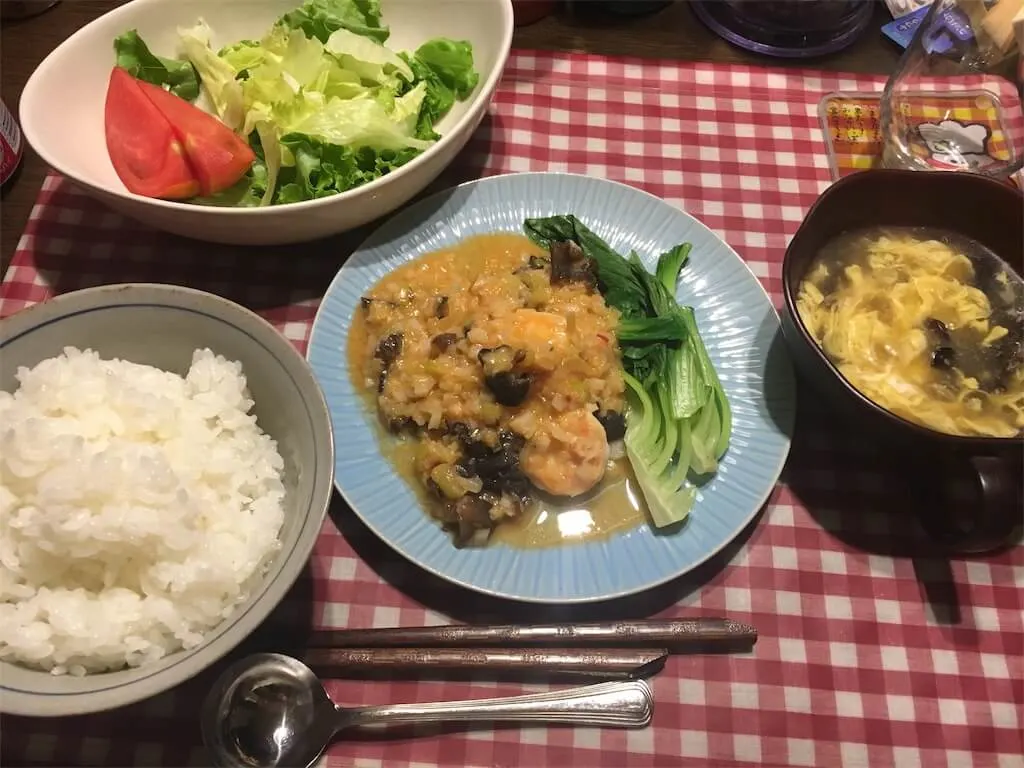 脇役の話もしようと思います。なぜなら青梗菜は寛容なので。(?)エビチリの餡?の部分はれんこんのとネギでできてます。れんこんをみじん切りの形で使うのあんまり一般的はないのかなって思うんだけど、ちょっととろみが出たりしていいよ。入ってるきくらげは今日は生きくらげでした。ぷるぷるだよ!