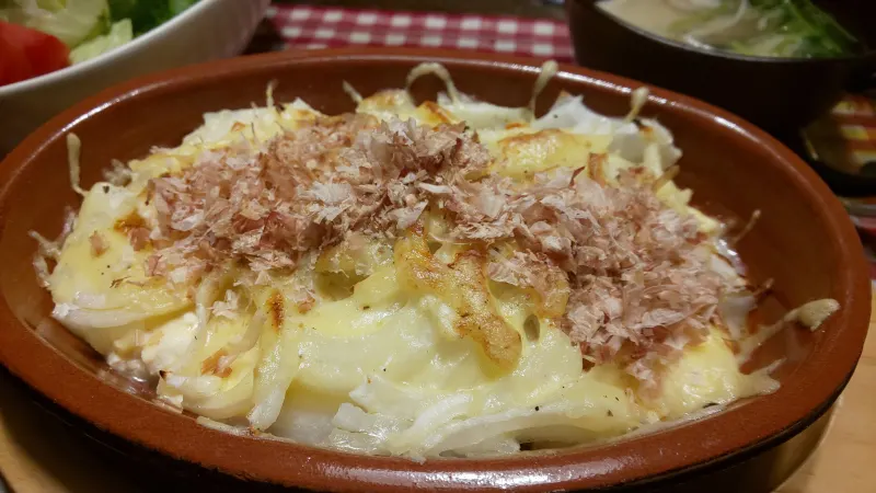 白菜と豚肉、鶏肉、干し椎茸をごま油と水で煮ただけです。各自の皿で塩と一味唐辛子とで味の調整をします。中国のピェンロー鍋ってのをベースにしてます。うちにおいては妹尾河童氏の著書「河童のスケッチブック」から取り入れてやるようになりました。