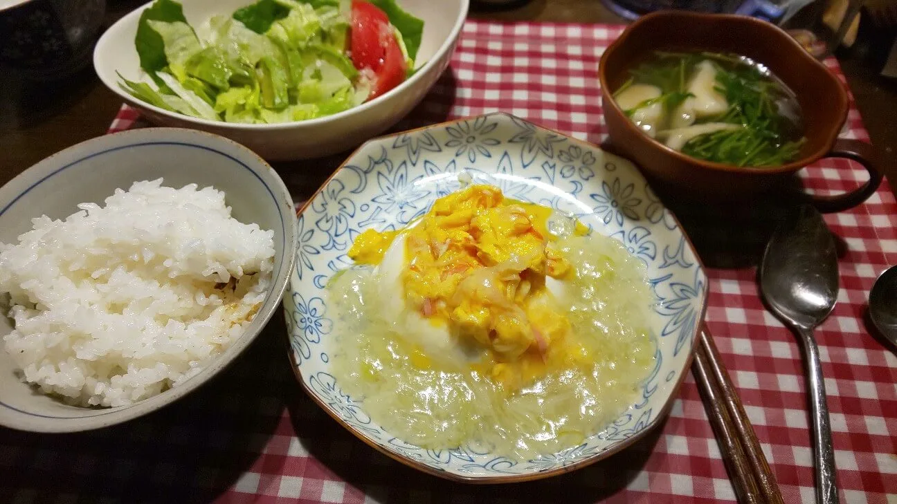温かくしたお豆腐にネギのあんかけとかにたまをでろっとしたやつです。ネギいいよねネギ。ネギだけで結構ごはん食べられそう。