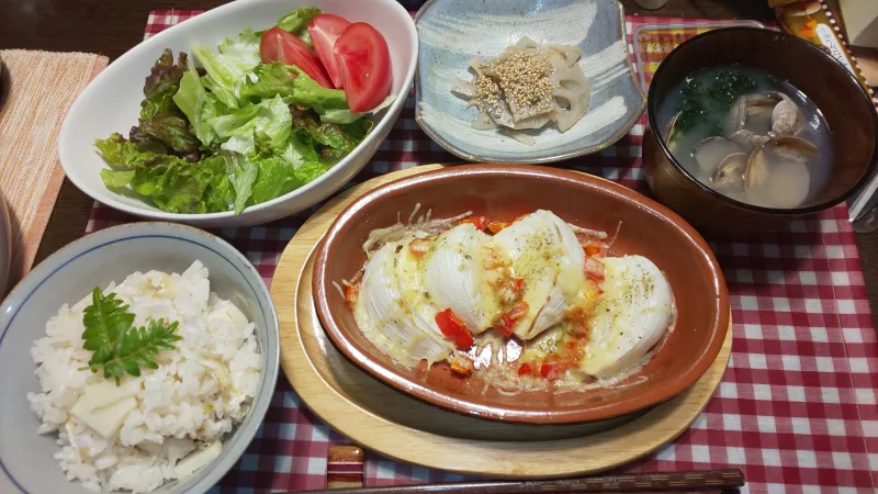 つくしって土筆って書くらしい あんま春っぽい気分じゃないけど春なので。あと木の芽が出たので。 たけのこごはんです。うちの山椒がまた今年もいい感じに芽を出したので。 玉ねぎにパプリカ添えてチーズかけ...